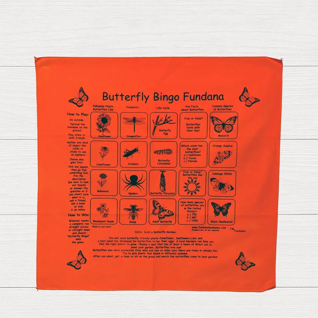 The Butterfly Bingo Fundana is a colorful, bingo-style nature game that helps kids learn about butterflies, their predators, life cycles, and pollinator gardens—all through observation and play. Printed on a soft, durable cotton bandana, it’s perfect for kids, families, classrooms, camps, and scout groups.