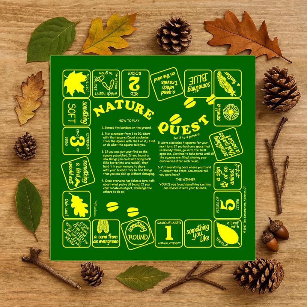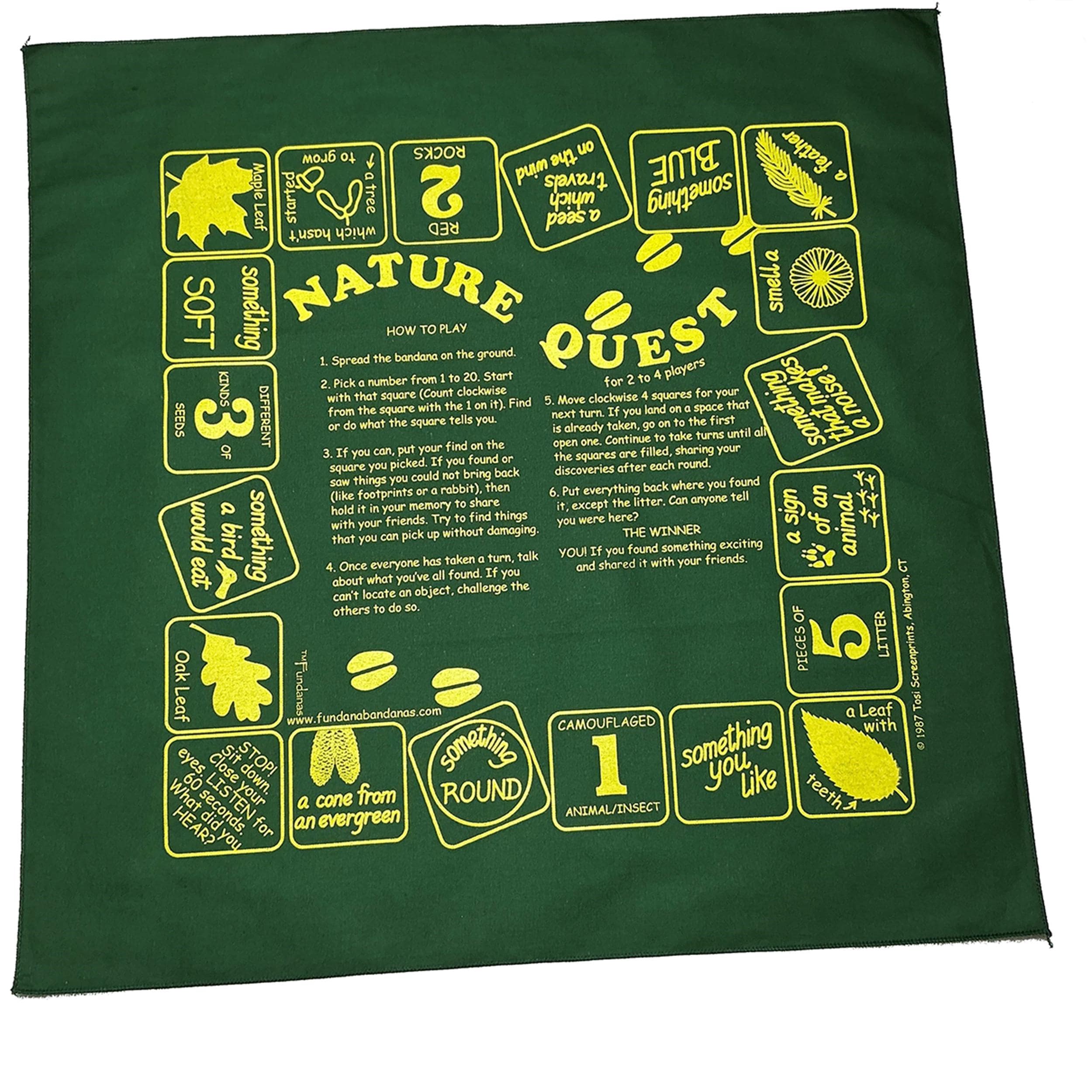 The Nature Quest Fundana is printed on a soft forest green made in USA 100% cotton bandana. Different sticks or stones can be used a markers in the game.