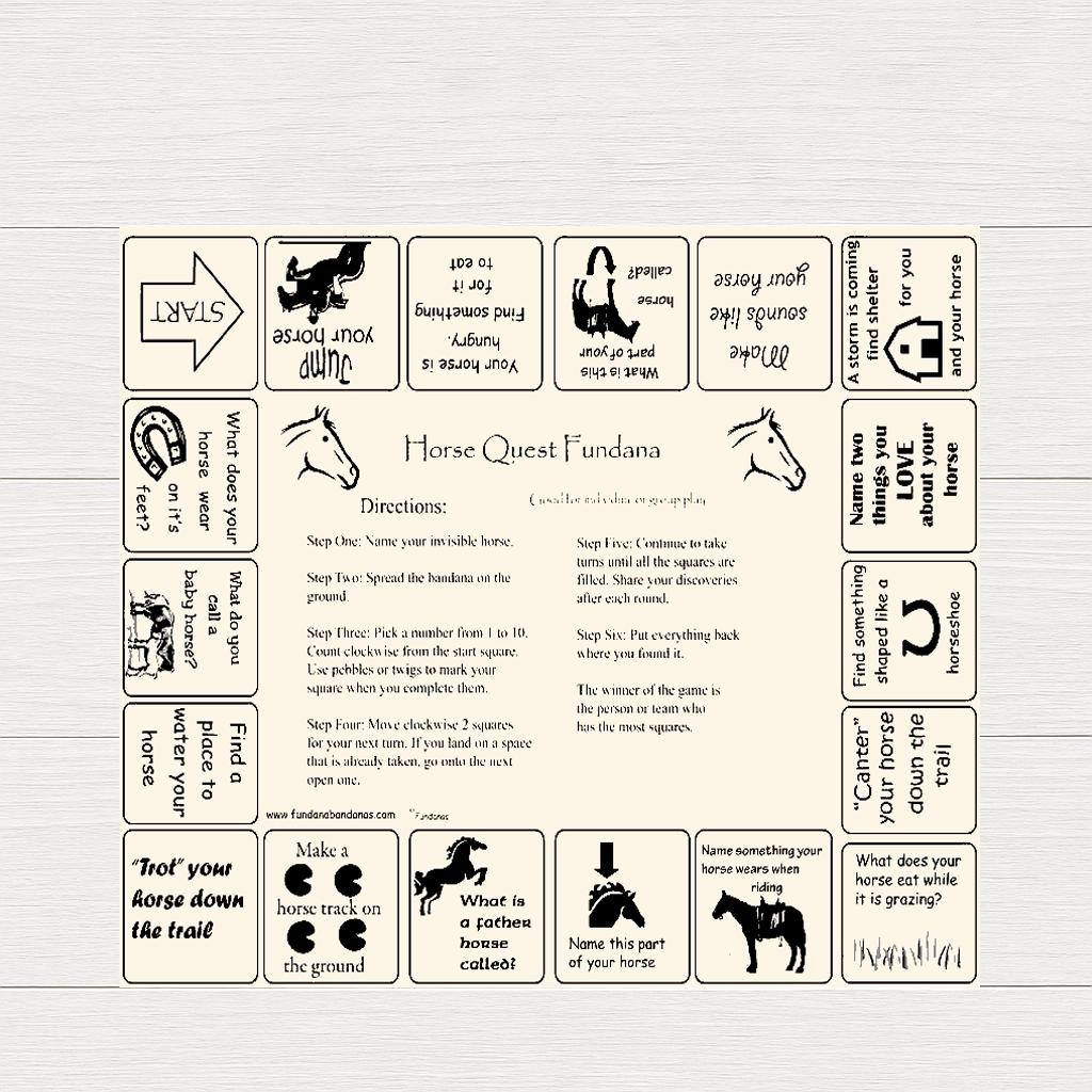 The Horse Quest Fundana is a creative, interactive game that lets kids pretend to be a horse while learning fun facts and getting active outdoors! Whether itās in the backyard, at a horse camp, or part of a scout program, this bandana game brings horseplay to lifeāliterally!