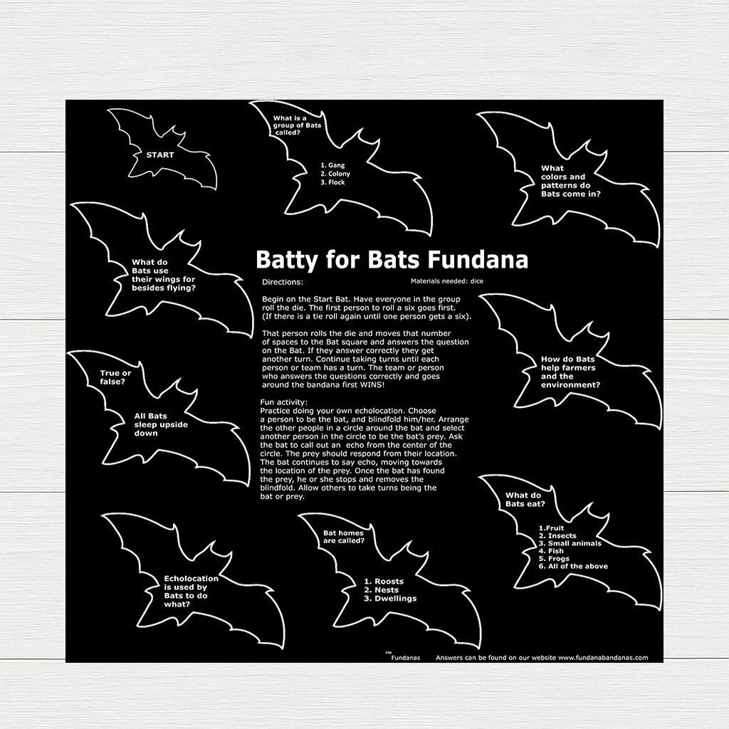 The Batty for Bats Fundanas are printed on a soft, black 100% cotton made in USA bandana.