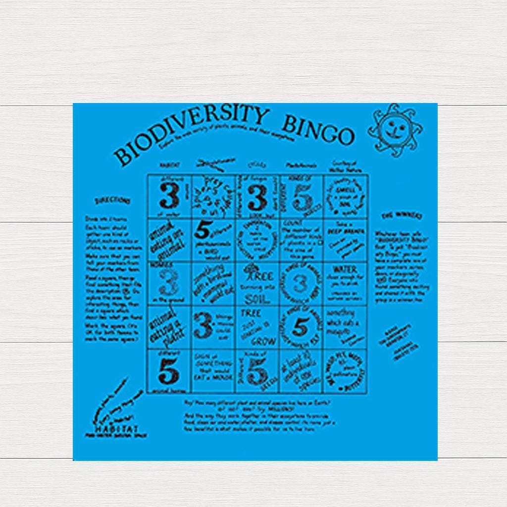 The Biodiversity Bingo Fundana is an exciting educational game that helps kids discover the amazing variety of life on Earth. Printed on a colorful cotton bandana, the bingo grid includes prompts related to plants, animals, insects, habitats, weather, and more.